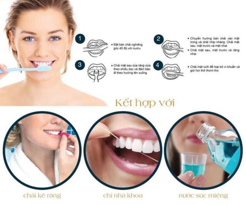 - Đánh răng ít nhất 2 lần/ngày bằng bàn chải lông mềm, chải nhẹ nhàng theo chiều dọc từ lợi xuống răng, không chà ngang mạnh.