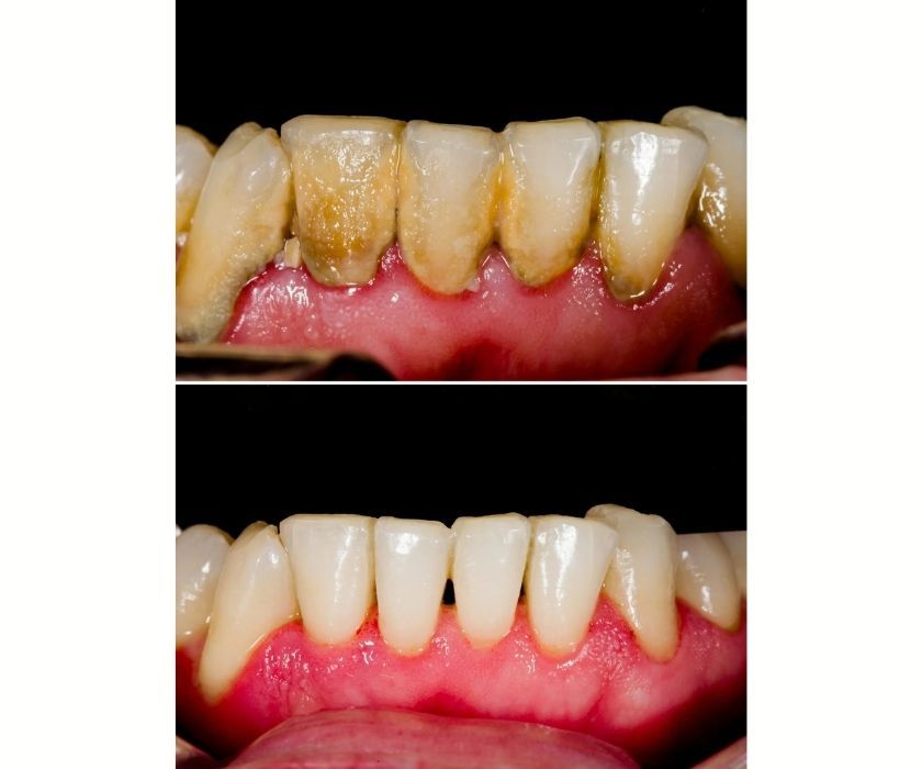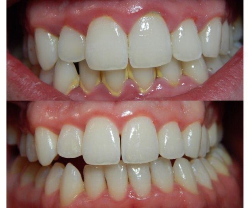 Các mảng vôi và cặn bẩn thường có màu vàng hoặc nâu sẫm, đặc biệt ở viền nướu, mặt trong răng cửa và vùng kẽ răng. Khi được làm sạch, răng trở nên sáng và đều màu hơn.
