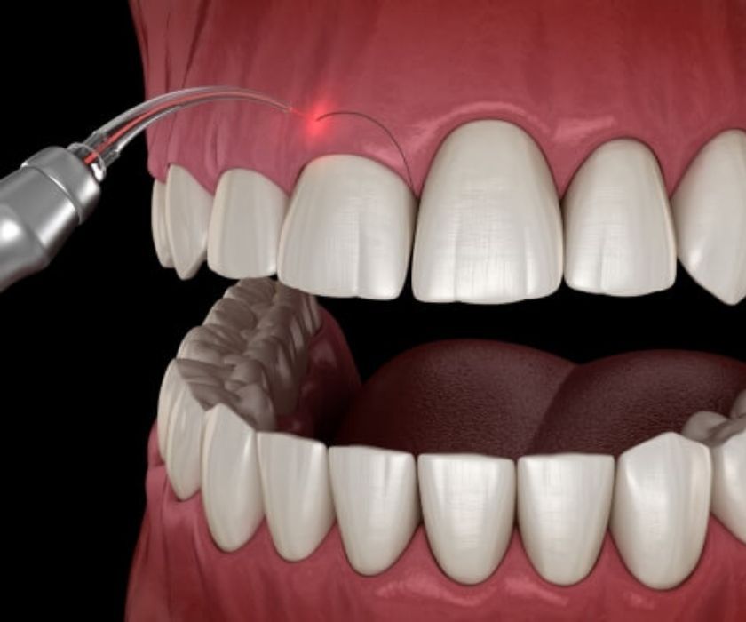 Cắt nướu tái định vị đường viền lợi bằng laser để tăng chiều cao thân răng.