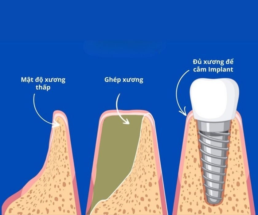 Trong nhiều trường hợp, ghép xương là thủ thuật bắt buộc để tái tạo thể tích xương cần thiết, tạo nền móng vững chắc cho trụ Implant. Vật liệu ghép có thể là xương tự thân, xương đồng loại, hoặc vật liệu tổng hợp. Dù hiệu quả, thủ thuật này thường kéo dài thêm từ 4 đến 9 tháng để xương ghép tích hợp, và tăng tổng chi phí điều trị.
